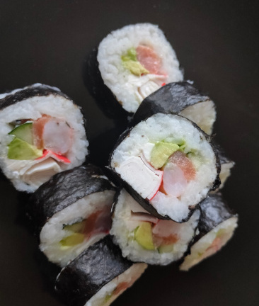 FILADELFIA MAKI$85 PD: pepino, aguacate y salmón, pescado empanizado, camarón o cangrejo PF: queso crema