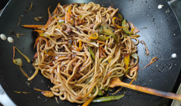 YAKIUDON$140 Fideos japonés fritos acompañados con champiñón, zanahoria, cebollín, calabaza, pollo y camarón sazonados en salsa teriyaki