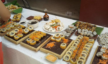 TORY MAKI$120 PD: zanahoria, champiñón, pimiento, calabaza, cebolla y queso crema PF: rollo envuelto en pechuga de pollo, empanizado, con gratin de queso por encima y aderezado con salsa agridulce