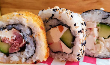ARCOIRIS MAKI$115 PD: aguacate, pepino y surimi PF: masago, salmón, plátano frito, queso crema, ajonjolí y cangrejo importado